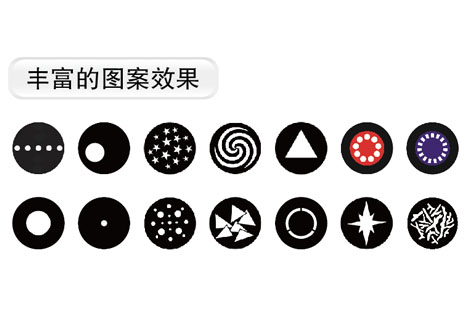 1個固定圖案盤,1個旋轉圖案盤,14個可更換圖案片(可選配),具有變速抖動效果、雙向變速流動效果