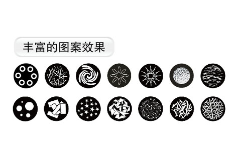 1個旋轉(zhuǎn)圖案盤: 7個可換圖案片+白光,可安裝玻璃圖案片和金屬圖案片,雙向變速旋轉(zhuǎn),具有索引功能,變速抖動效果、雙向變速流動效果;1個固定圖案盤:7個可換圖案片+白光,具有變速抖動效果、雙向變速流動效果