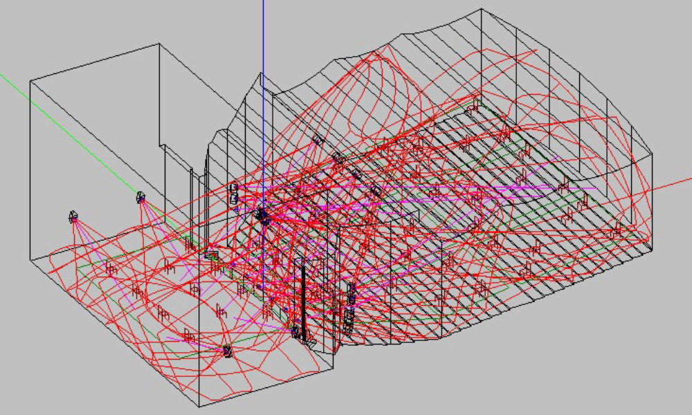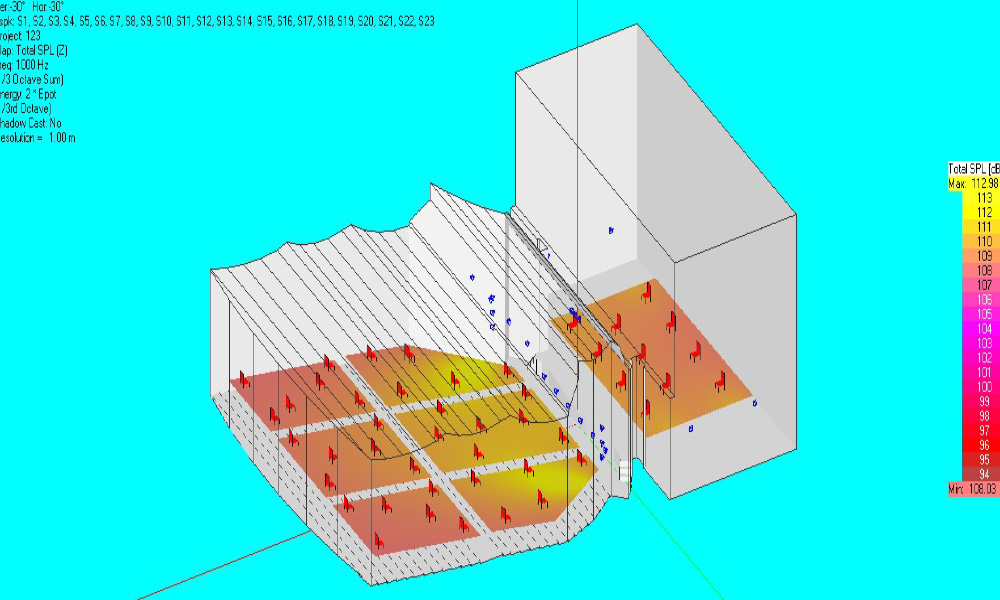 本項(xiàng)目系統(tǒng)較多,為了能把這次的改造工作做到盡可能的,我們認(rèn)真采集現(xiàn)場(chǎng)房間的數(shù)據(jù)后,利用EASE4.0軟件,對(duì)影劇院的聲場(chǎng)擴(kuò)聲進(jìn)行計(jì)算機(jī)模擬輔助設(shè)計(jì),通過音箱選型后,影劇院 的模擬設(shè)計(jì)各項(xiàng)指標(biāo)都達(dá)到了國(guó)家相關(guān)標(biāo)準(zhǔn)《GB50371-2006》劇場(chǎng)類一級(jí)標(biāo)準(zhǔn)。