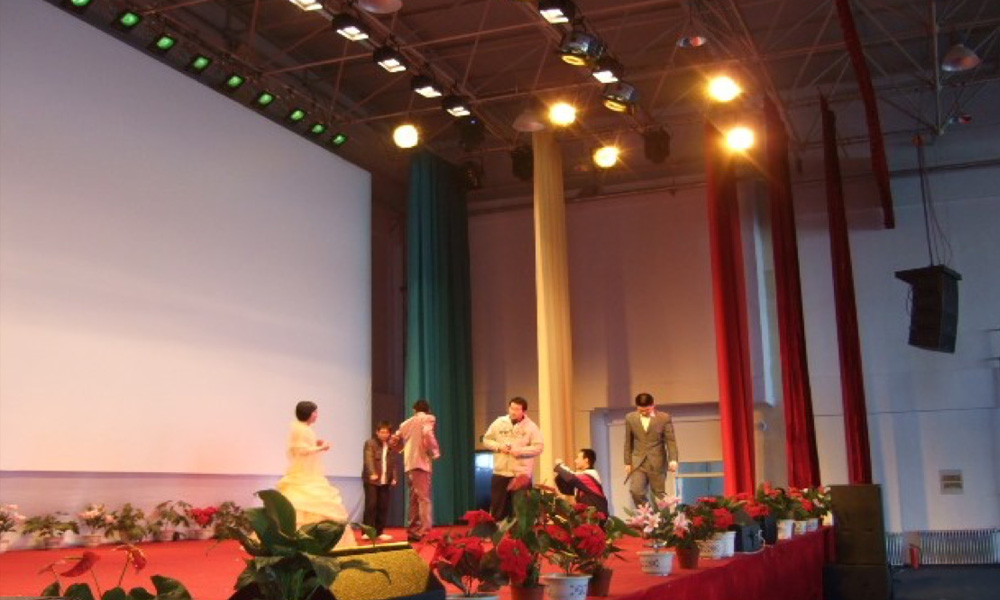 右兩邊各一組,每組由4只雙12寸的全頻陣列音箱組成覆蓋全場,還配置了4只雙18寸的超低音箱, 在文體館的各個(gè)觀眾席位置都能滿足語言清晰度和聲壓級要求。