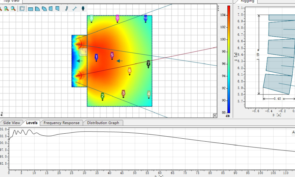本項(xiàng)目的擴(kuò)聲系統(tǒng)采用我國BOBaudio品牌的 線性陣列音箱組成集中供聲,在體育場的主席看臺的 左右兩邊各一組線性陣列音箱,每組音箱由4只全頻音 箱音箱組成,覆蓋整個(gè)全場,在主席臺的左右側(cè)邊各 由2只全頻音箱組成輔助補(bǔ)聲,覆蓋主席臺的左右側(cè)的 看臺區(qū),這樣整個(gè)體育場都被聲音覆蓋,由于線性音 箱的擴(kuò)聲原理,滿足聲投射距離達(dá)到約90米遠(yuǎn)的 需求,通過測試聲壓級、語言清晰度、無線話筒的傳 輸?shù)葷M足聲場需求,我們也通過聲學(xué)EASE FOCS 軟件的輔助設(shè)計(jì)及安裝驗(yàn)證。